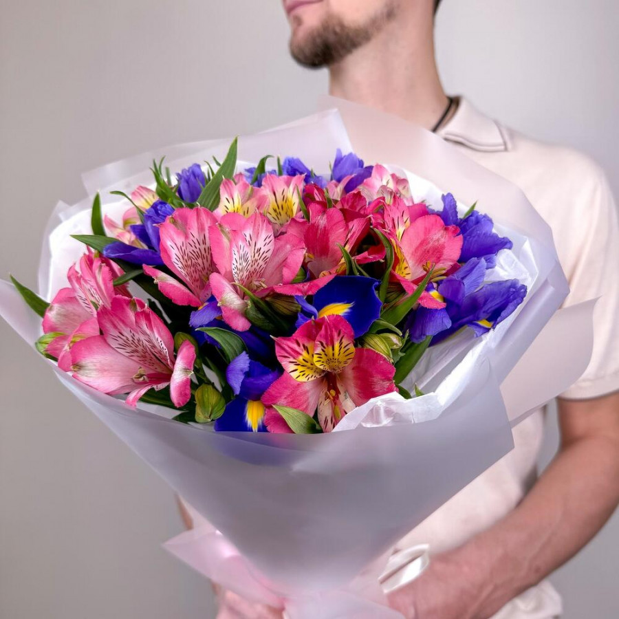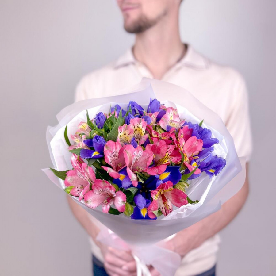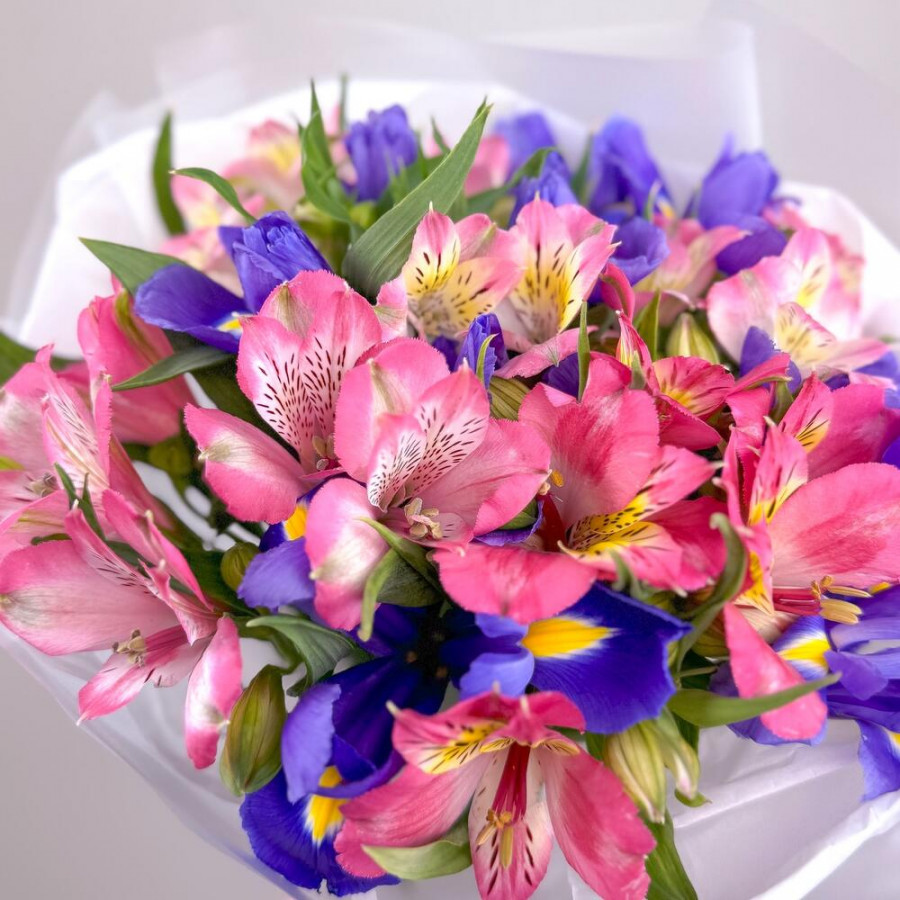Букет из синих ирисов из розовых альстромерий в Большом Камене